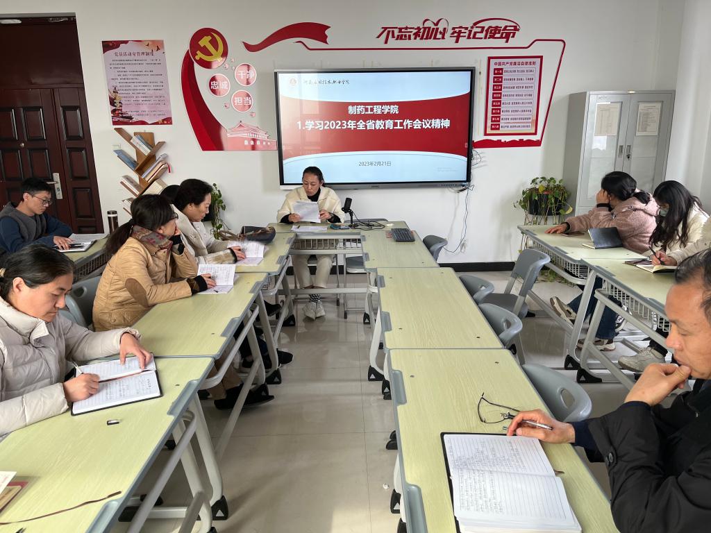 为学习贯彻党的二十大精神,认真贯彻落实习近平总书记关于教育的重要论述,深刻领悟河南省教育厅2023年全省教育工作会议精神,根据学校相关工作安排,制药工程学院于2023年2月21日组织全体教师开展专题学习。