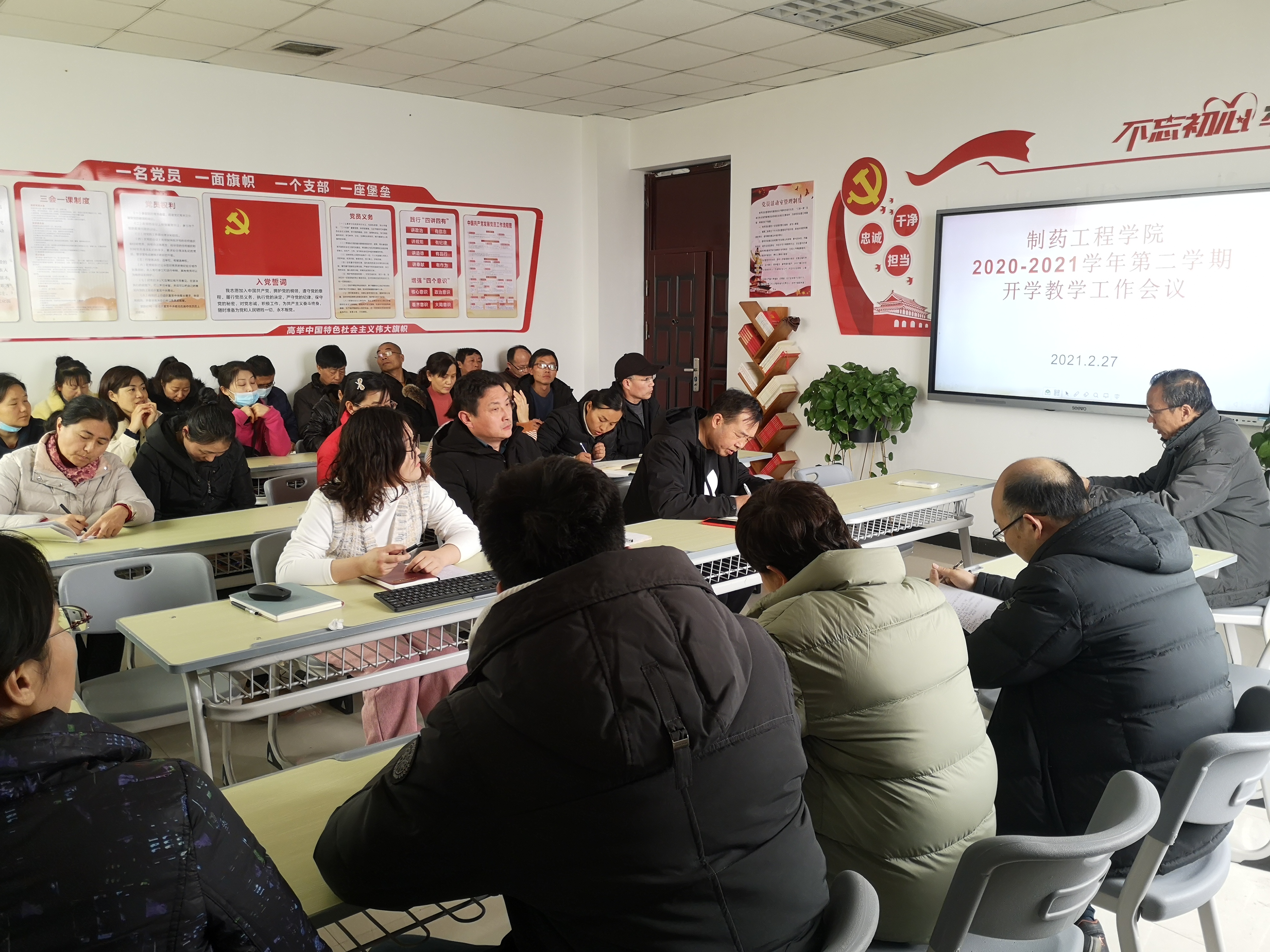 2月27日下午,制药工程学院在办公楼501党员活动室召开了2021年新学期教学工作会议。会议由学院韩院长主持。学院各教研室主任、专业负责人及全体专兼职教师参加会议。