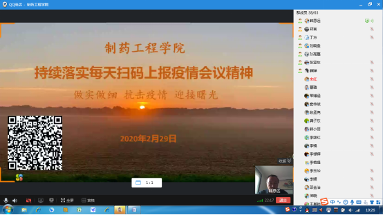 2020年2月29日,制药工程学院通过QQ群视频,召开制药工程学院教师会议。传达教育厅对师生扫码上报疫情的要求,制药工程学院专职教师、专职辅导员、实训管理员参会。