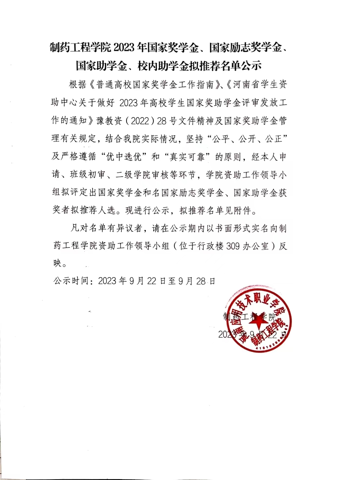 制药工程学院 2023 年国家奖学金、国家励志奖学金国家助学金、校内助学金拟推荐名单公示
