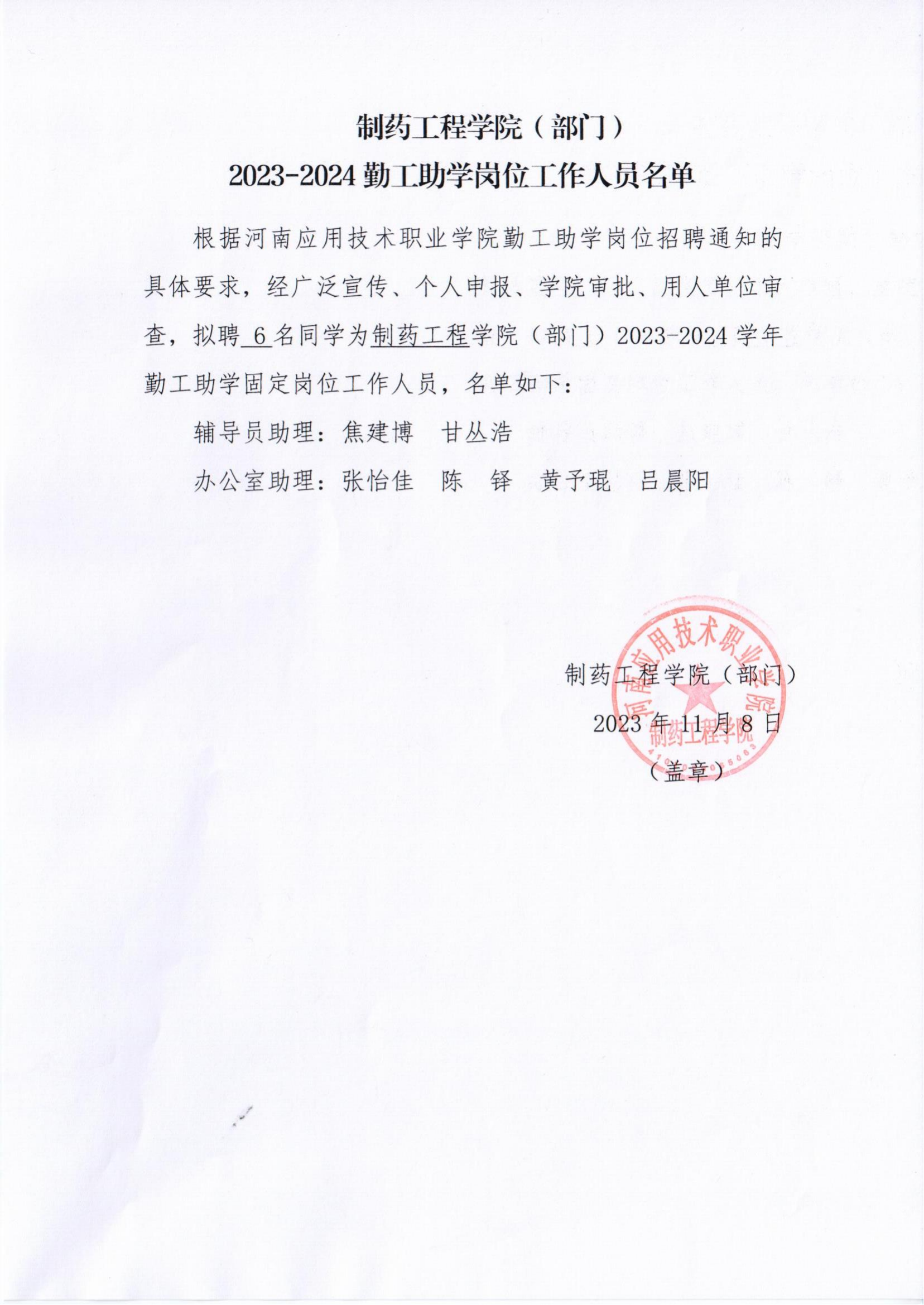 制药工程学院(部门)2023-2024勤工助学岗位工作人员名单