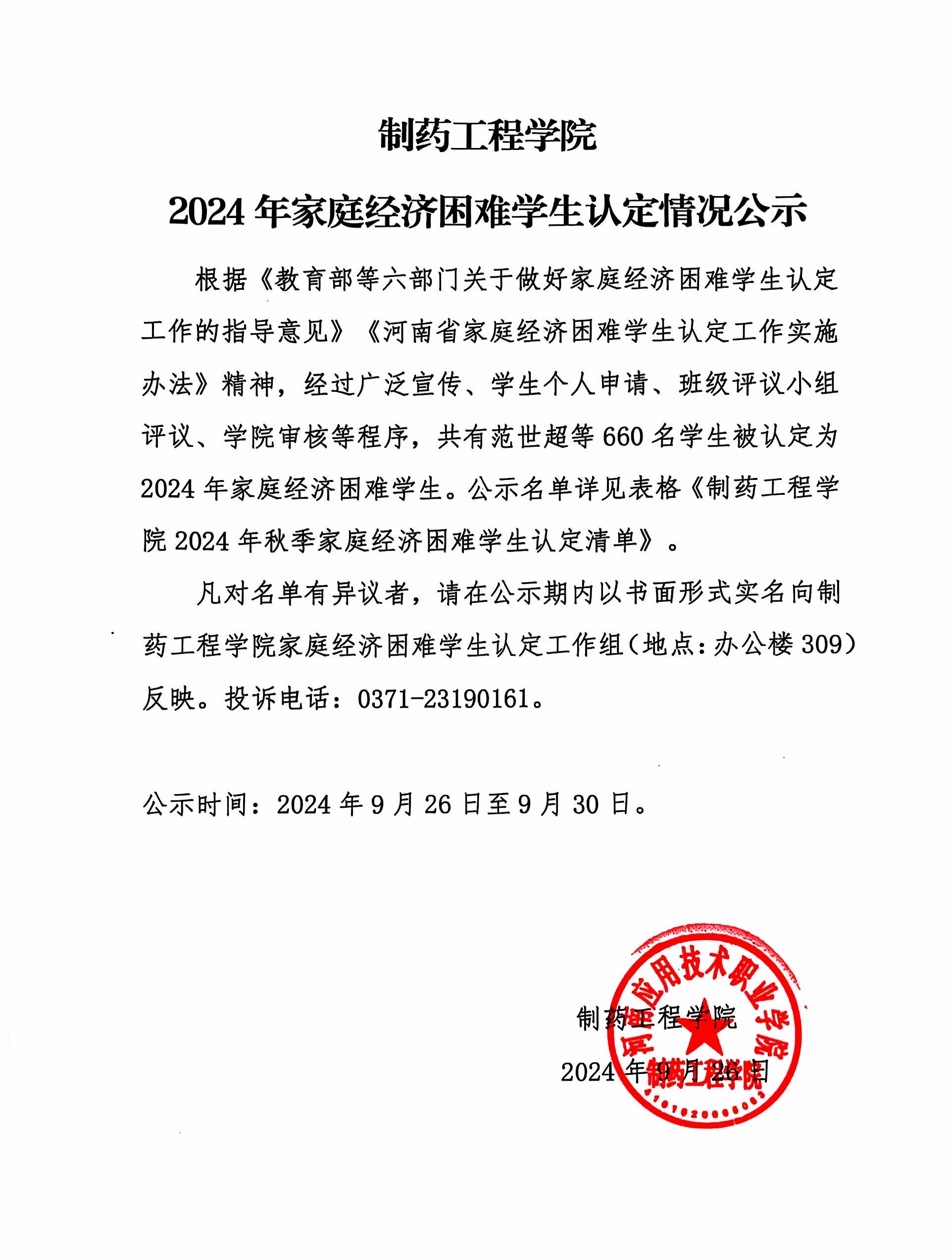制药工程学院2024年家庭经济困难学生认定情况公示
