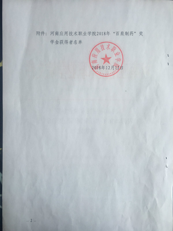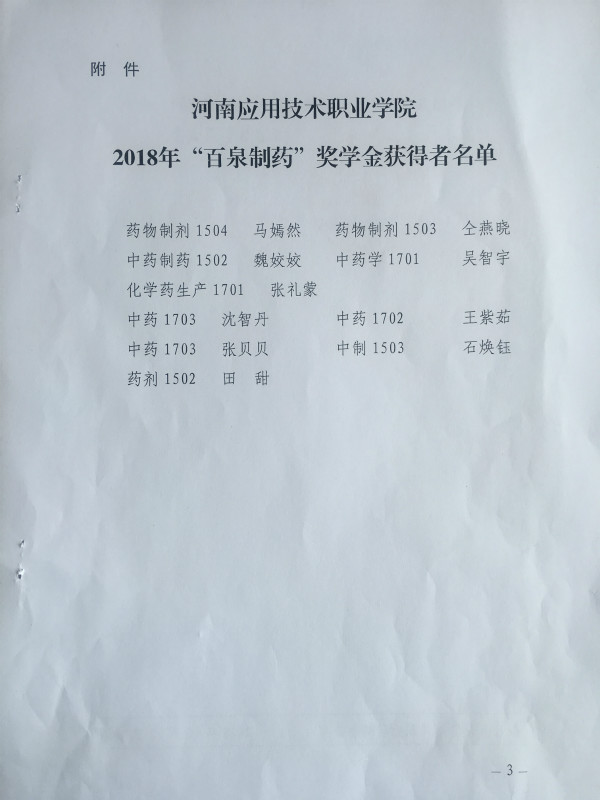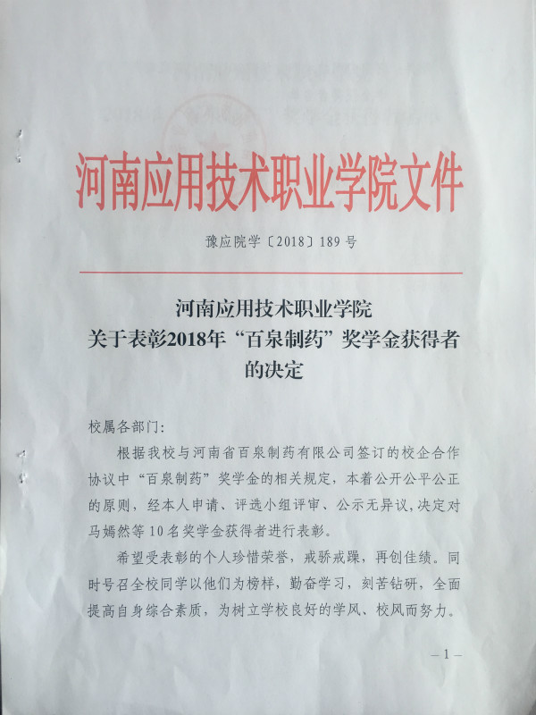 根据我校与河南省百泉制药有限公司签订的校企合作协议中“百泉制药”奖学金的相关规定,本着公开公平公正的原则,经层层评审,我院共6名同学荣获该项奖学金。