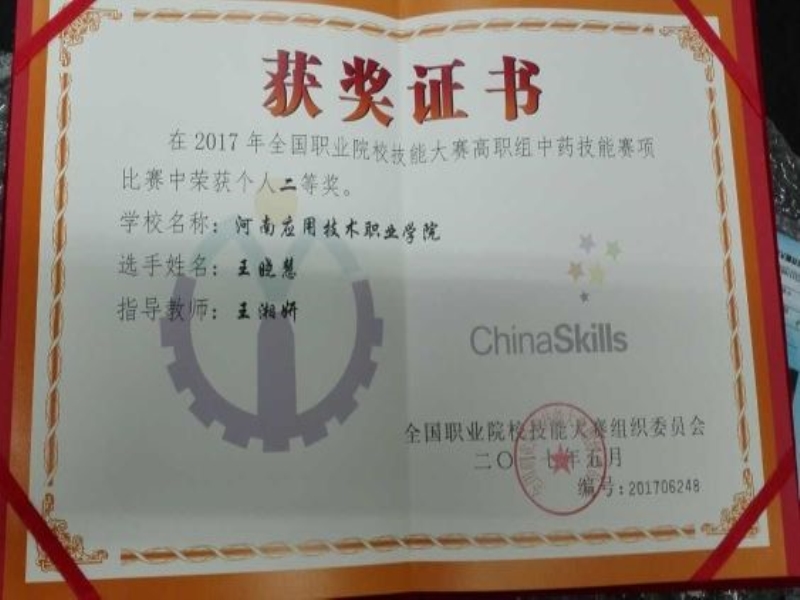 王晓慧同学荣获中药技能赛项竞赛高职组二等奖