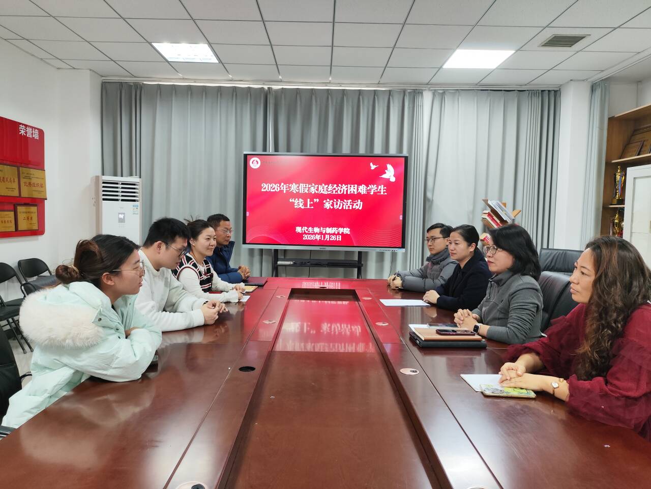 为扎实推进资助育人工作,切实关心家庭经济困难学生寒假生活状况,1月26日,pg游戏电子模拟器以线上视频连线形式,开展2026年家庭经济困难学生“线上”家访活动。学院党总支书记梁艳、院长王湘妍、党总支副书记王俊永、副院长高莉丽、资助专员焦汉生及辅导员代表参与此次活动,与学生代表进行“零距离”线上交流。
