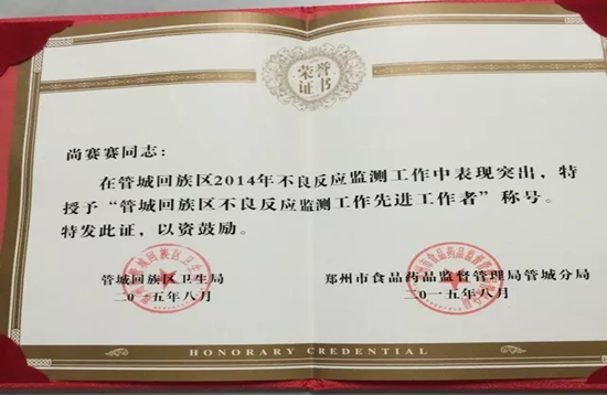 2014年被被评为管城区不良反应监测工作先进工作者。